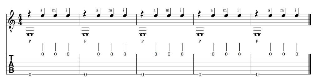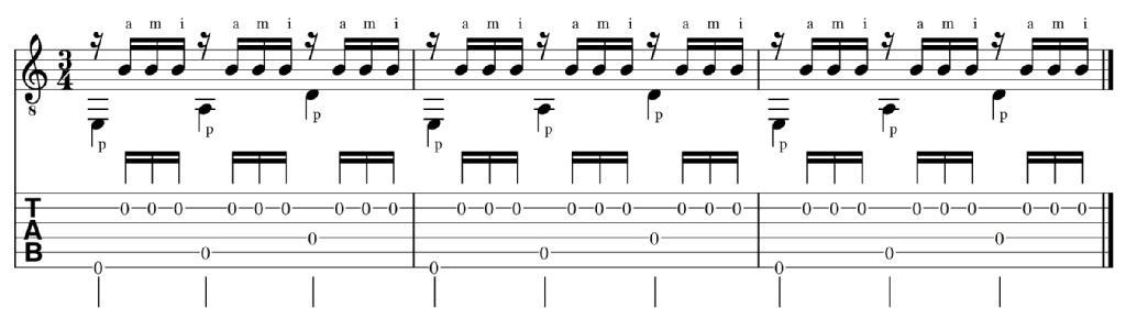 Tremolo is being played by the thumb followed by the ringfinger, middle finger and the index. Very slowly played it is like 4/4 time.