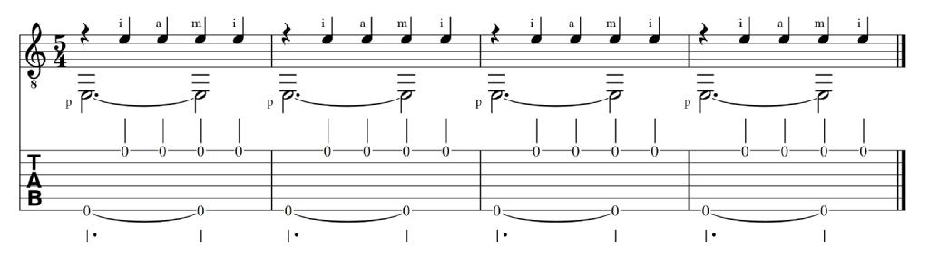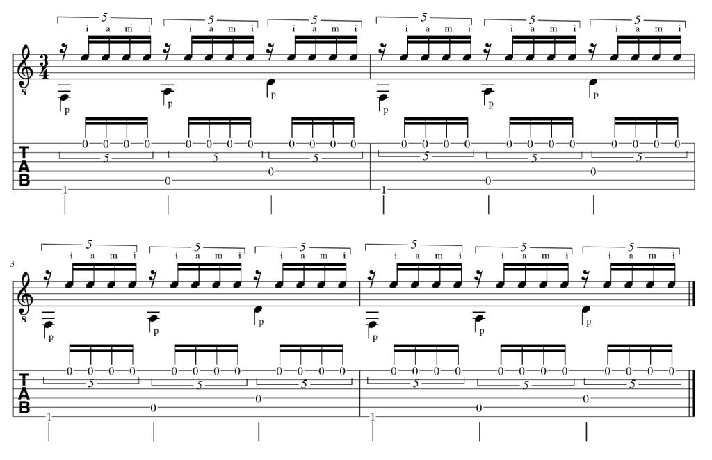 Quatremolo (or flamenco tremolo) is being played by the thumb followed by the index, ringfinger, middle finger and the index again. Very slowly played it is like 5/4 time.